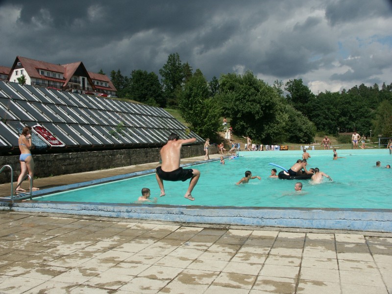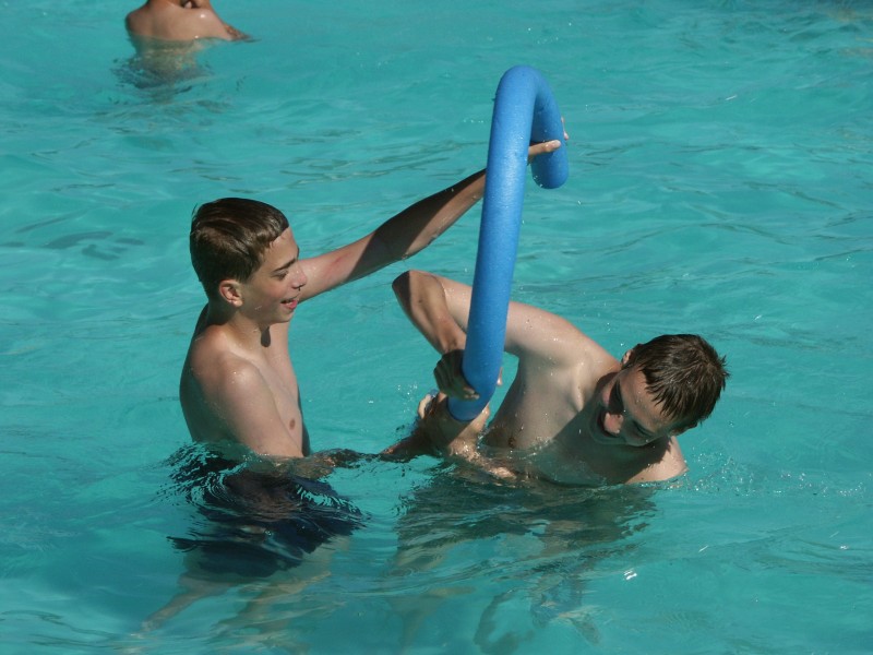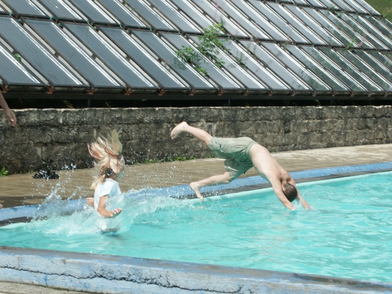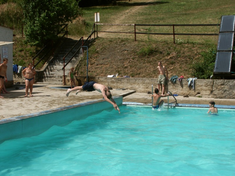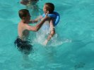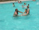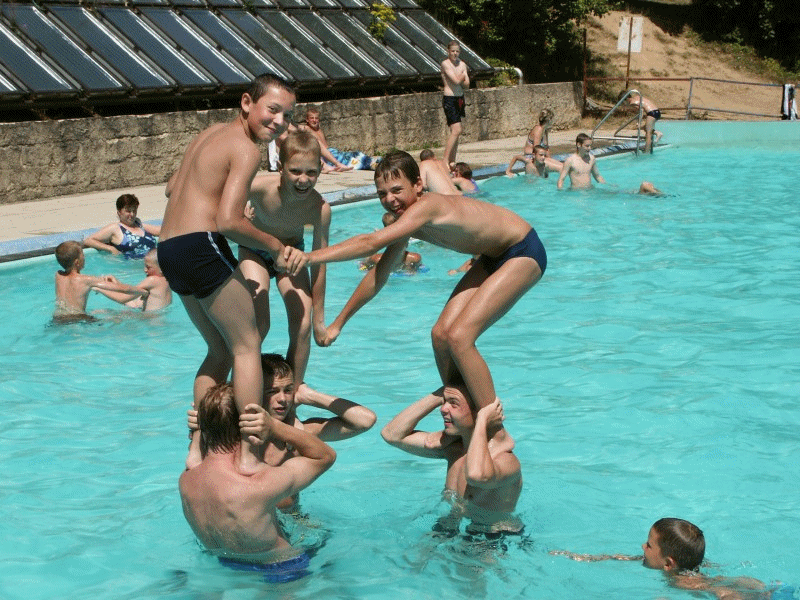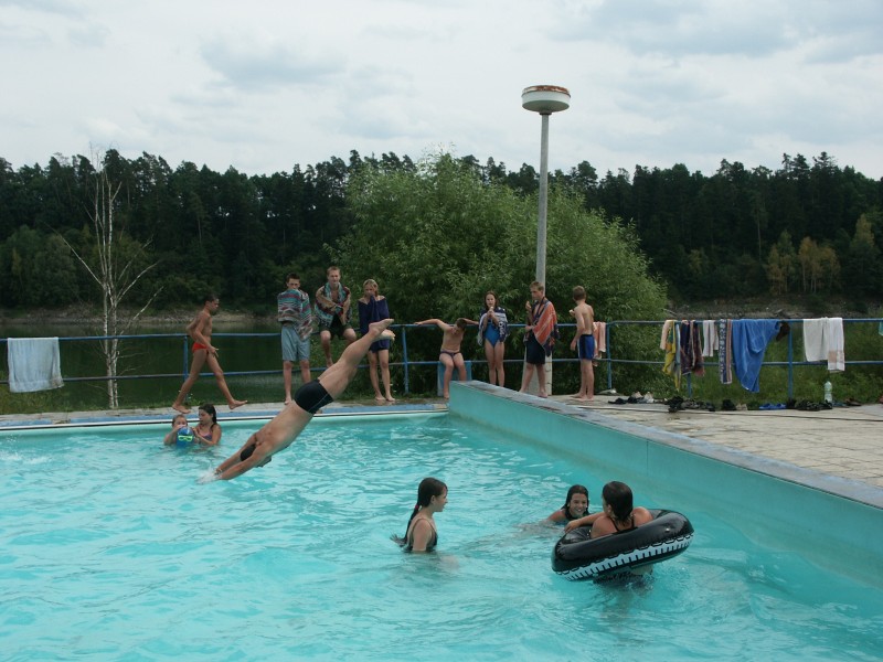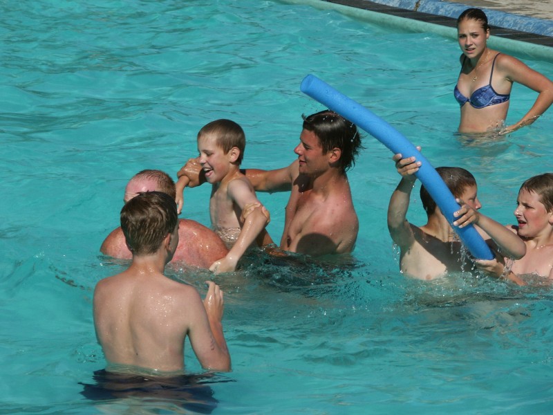 Oblíbenou letošní činností v bazénu byla snaha o stavění různých (co největších) pyramid a snaha o jejich