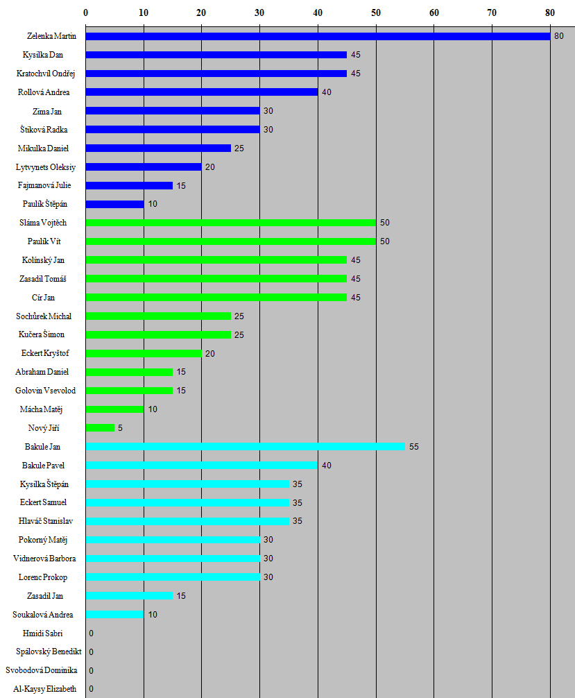 Při shodném počtu bodů Vítězí ten, kdo má nižší kyu (první dvě věkové kategorie) a v případě shody ten, kdo měl více bodů v kumite (nejmladší kategorie).