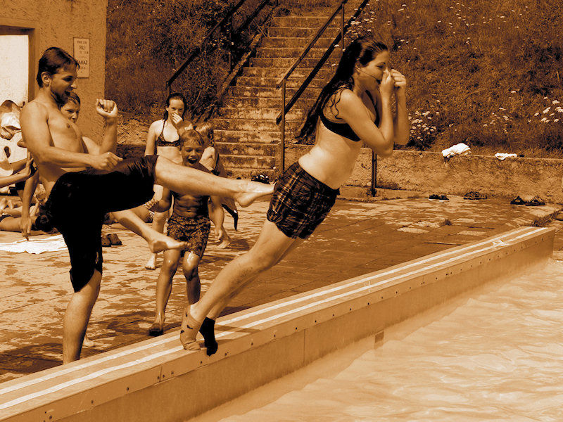 Pravda, bylo trochu chladno a voda v bazéně studená, ale postupně se spíš oteplovalo a ke konci už byla voda tak teplá, že jsme vodní
