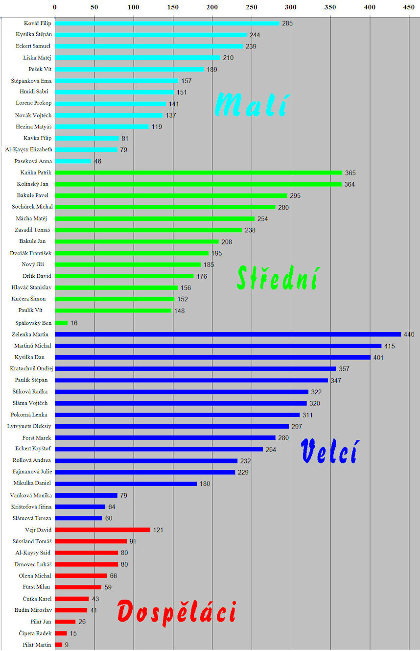 Pro hodnocení táborových soutěží se vždy dělíme na 3 věkové kategorie. Na víc to z početních