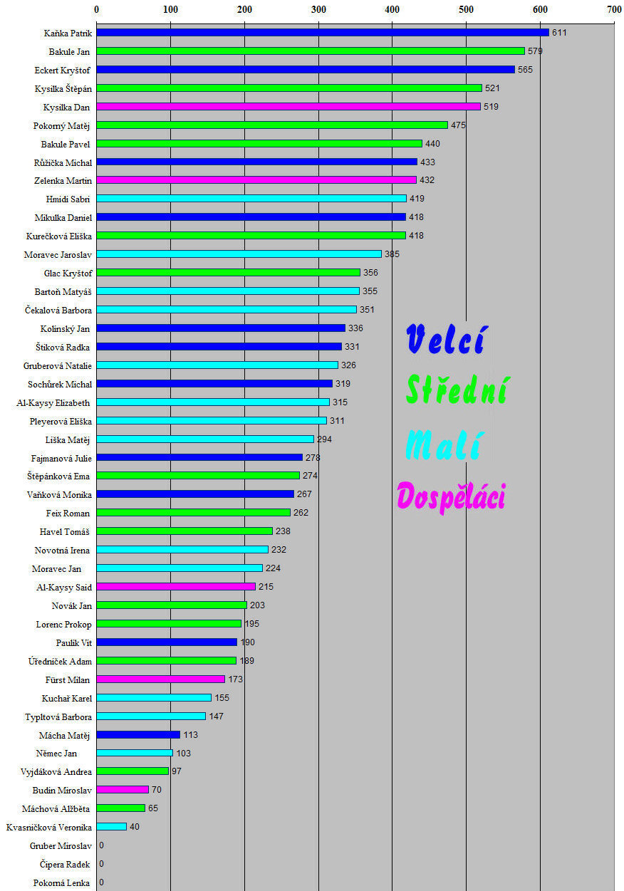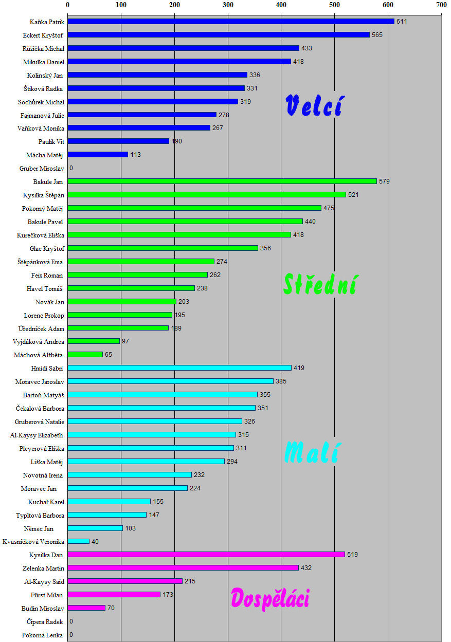 Na letošních výsledcích je ještě více než v minulosti patrné to, co mladším vysvětluju každý rok - soutěžit se staršími dohromady (tam, kde to fyzicky jde) je vždy výhoda. Nechybělo mnoho a celkovým absolutním vítězem by se stal člen až střední věkové kategorie. Ono to podobně bylo i loni - Honza Bakule poráží starší soupeře celkem běžně a i Štěpán, Matěj a Pavel jsou v celkovém pořadí před většinou členů nejstarší kategorie - jak je vidět z grafu celkových výsledků. A neztratil se ani Sabri, vítěz nejmladší kategorie. Graf celkových výsledků podle věkových kategorií |